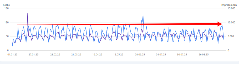 In der GSC erkennst du dieses Muster daran, dass Klicks und Impressionen über mindestens drei bis vier Monate in einem engen Band schwanken, ohne dass ein Aufwärts- oder Abwärtstrend erkennbar ist — und ohne dass du in diesem Zeitraum wesentlich neue Inhalte publiziert oder bestehende aktualisiert hast.
