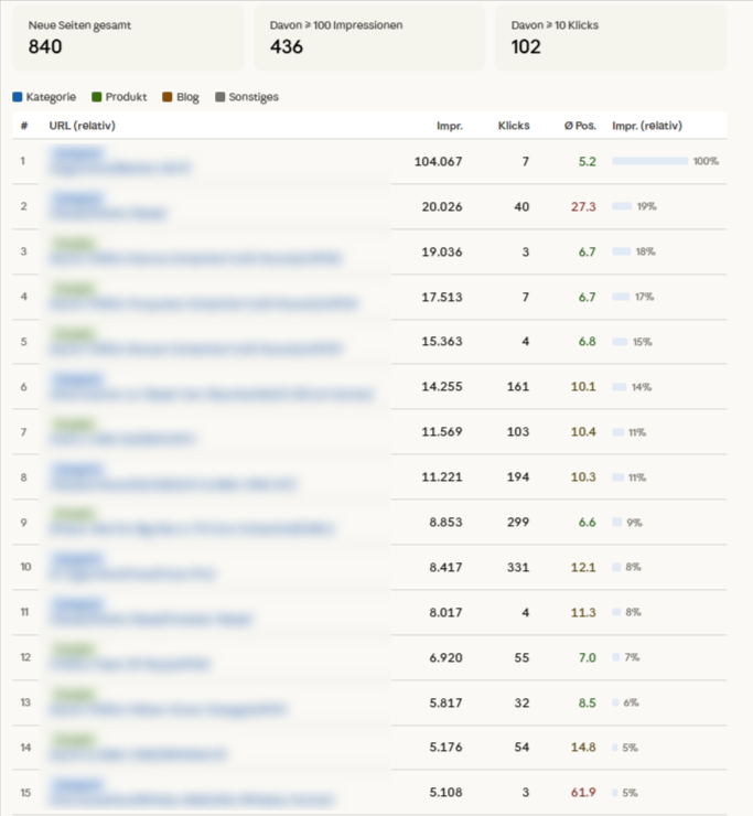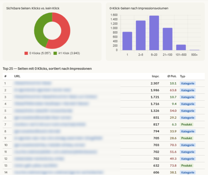 Was du damit diagnostizierst: Den Anteil deiner Website, den Google zwar ausspielt, der aber keinen einzigen Klick erzeugt. Jede dieser Seiten verbraucht Crawl-Budget, ohne etwas beizutragen. Ein geringer prozentualer Anteil ist okay und völlig normal, besonders bei größeren Seiten. Ein deutlich höherer Anteil ist ein Warnsignal.