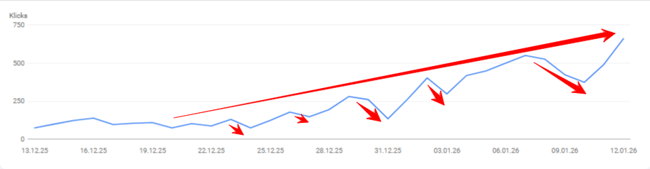 Ein zweites Muster betrifft das Verhalten nach Core Updates. Bei Websites, die sich bereits in einem positiven Zyklus befinden, passiert bei einem Core Update oft etwas Unerwartetes: Statt eines graduellen Anstiegs springt die Kurve auf ein neues Niveau. Nicht um 10% höher, sondern auf ein komplett anderes Band. Auch dies kann im oberen GSC-Chart zum Jahreswechsel von ’25 auf ’26 beobachtet werden.
