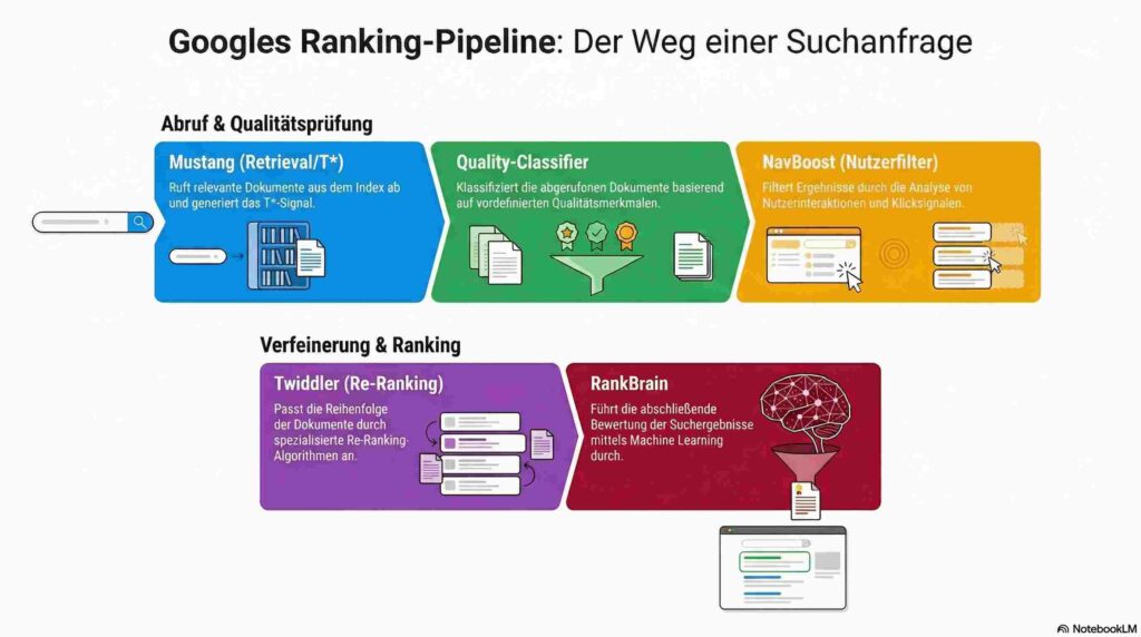 Am Anfang steht die Frage: Welche Dokumente kommen überhaupt als Kandidaten in Betracht? Das übernimmt ein System namens Mustang. Es ist Googles Primary Scoring System — der erste Durchlauf durch den Index, der aus Milliarden von Dokumenten eine handhabbare Kandidatenmenge erzeugt. Mustang bewertet Dokumente auf Basis von Relevanz-Signalen: Stimmen die Terme überein? Wie stark ist die thematische Übereinstimmung?